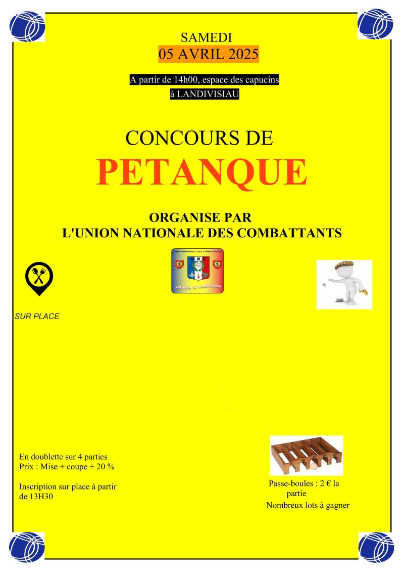 Bonne affluence pour le concours de pétanque en doublettes organisé par l’association locale de l’UNC (Union Nationale des Combattants) de Landivisiau qui s’est déroulé samedi 19 octobre 2024 au boulodrome des Capucins.